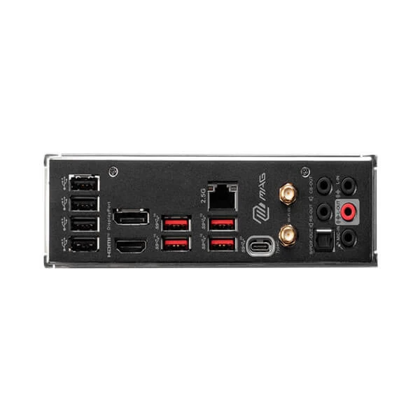 | BACK PANEL PORTS | USB 2.0 DisplayPort 1.4 USB 3.2 Gen 2 10Gbps Type-A 2.5G LAN Port Wi-Fi / Bluetooth Antenna HD Audio Connectors HDMI? 2.1 Port USB 3.2 Gen 2×2 20Gbps Type-C Optical S/PDIF OUT |